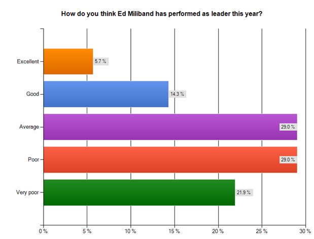 Ed Miliband’s performance was Average to Poor in 2011 – that’s the verdict of LabourList readers in our end of 2011 survey. 29% of those who voted believed that Miliband’s performance had been Average in 2011, compared to 29% who thought he had been poor and nearly 22% who thought that his performance had been Very Poor. That contrasts with just 20% who thought Miliband had an Excellent or Good 2011 – similar to his performance in December’s “State of the Party” survey.