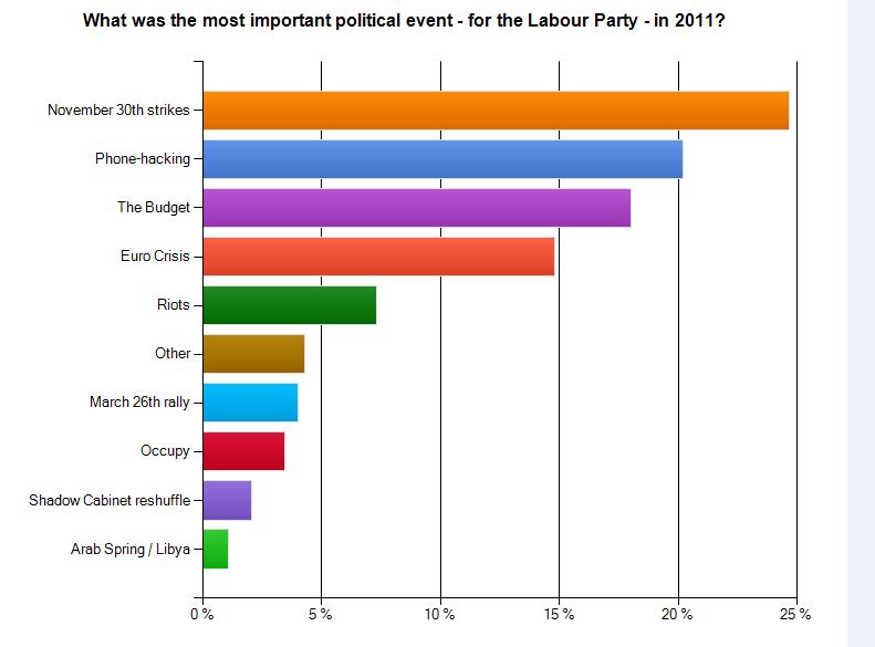 What was the biggest political event of the year for the Labour Party? According to LabourList readers the November 30th strikes were the most significant event for the party in 2011, edging past phone hacking, the budget and the Euro crisis. You can see how LabourList ranked some of the other significant political events of the year below.