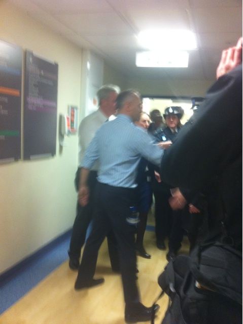 Andrew Lansley is at London’s Royal Free Hospital today. However as Camden New Journal reporter Tom Foot notes there is “Only one tv camera allowed in – no written or local press on orders of DoH,” so it’s remarkable that we know about the visit at all. Seemingly Lansley wanted to avoid protesters who were outside both the front and back of the hospital. That seems to have failed, judging by this photo (again from Tom Foot) that shows Lansley being confronted by protesters inside the hospital: