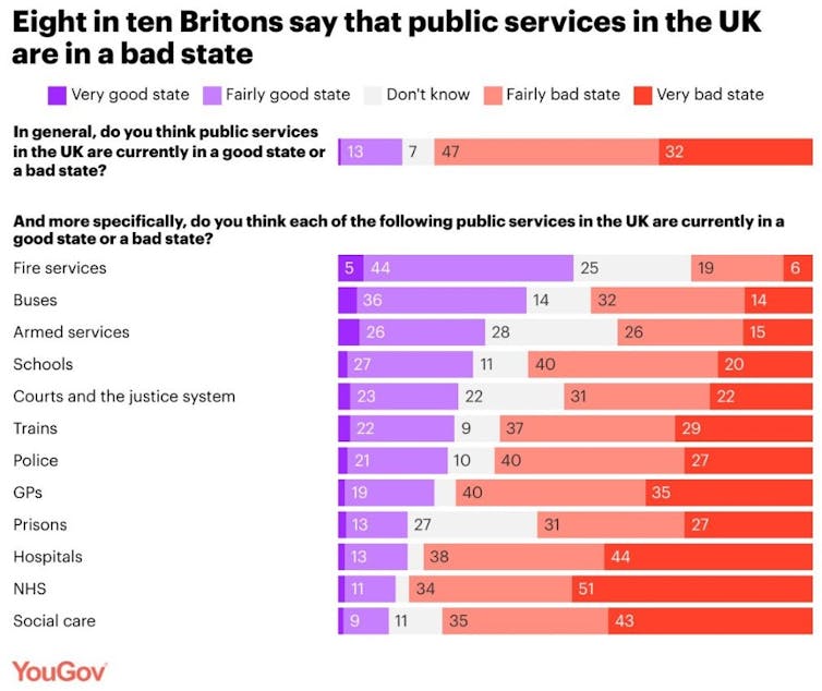 Economic growth projections are fragile. The public spending round estimates cuts in spending for 2025, at the same time a recent YouGov poll suggests 79% of voters believe that public services are in a poor state.