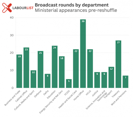 Ministers from the Home Office fielded the most broadcast rounds pre-reshuffle with 39 appearances, followed by the Treasury with 27, Education with 24, the Cabinet Office with 23 and Health and Social Care and Housing, Communities and Local Government tied with 22 each.