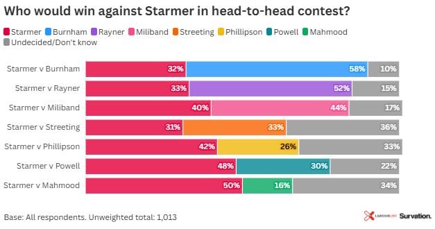Polling conducted by Survation for LabourList found Burnham and Rayner would defeat the incumbent Labour leader and Prime Minister by comfortable margins should an election take place, while Streeting and Miliband have a slight advantage, but within the margin of error.