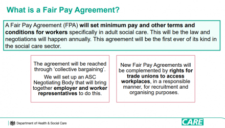 The FPA will oblige employer representatives and four unions to negotiate pay and certain terms and conditions annually for all adult social care workers. Three negotiating bodies will be launched for England, Scotland and Wales.