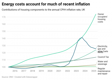 Energy costs have risen everywhere, but are particularly high in the UK, which has some of the highest electricity costs in the world. They now make up 10.5 per cent of low to middle income households’ non-housing consumption, up from about four per cent in 2003.