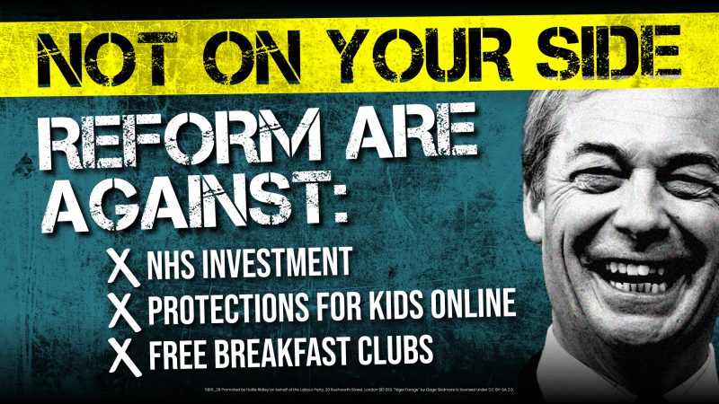 The campaign, being unveiled as the first week of Labour’s local elections campaign draws to a close, stresses that Farage is “not on your side”, highlighting how Reform voted against investment in the NHS, protections for children online and free breakfast clubs.